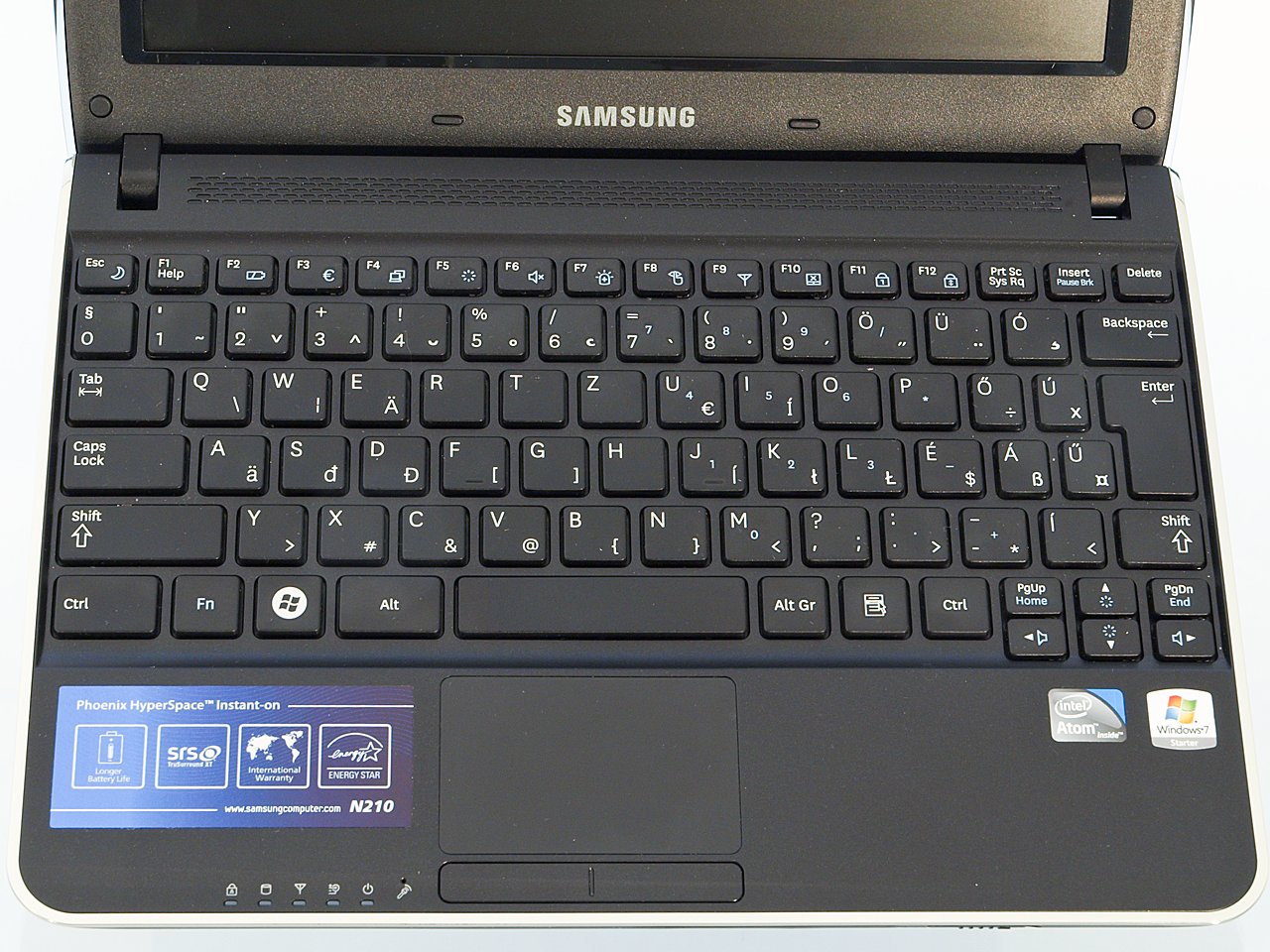 Persze ennek azért megvan a pozitív hatása is – a billentyűzet számára elég hely áll rendelkezésre, így netbookos mértékkel mérve kényelmesnek mondhatjuk, az Enter gomb és a bal Shift mérete például már-már az asztali gépekét idézi. A gombok kialakítása a trendnek megfelelően „chiclet” vagy „macbookos” vagy „vaios”, kinek hogy tetszik. A klaviatúra kiosztása összességében jó, egyedül a „hosszú í” van kicsit rossz helyen (a jobb Shift mellett). A függőleges helyhiány miatt a funkciógombok vékonyabbak az átlagosnál , plusz billentyűknek pedig nem maradt hely – utóbbiakat a Samsung az Fn+funkciógombok segítségével váltotta ki.