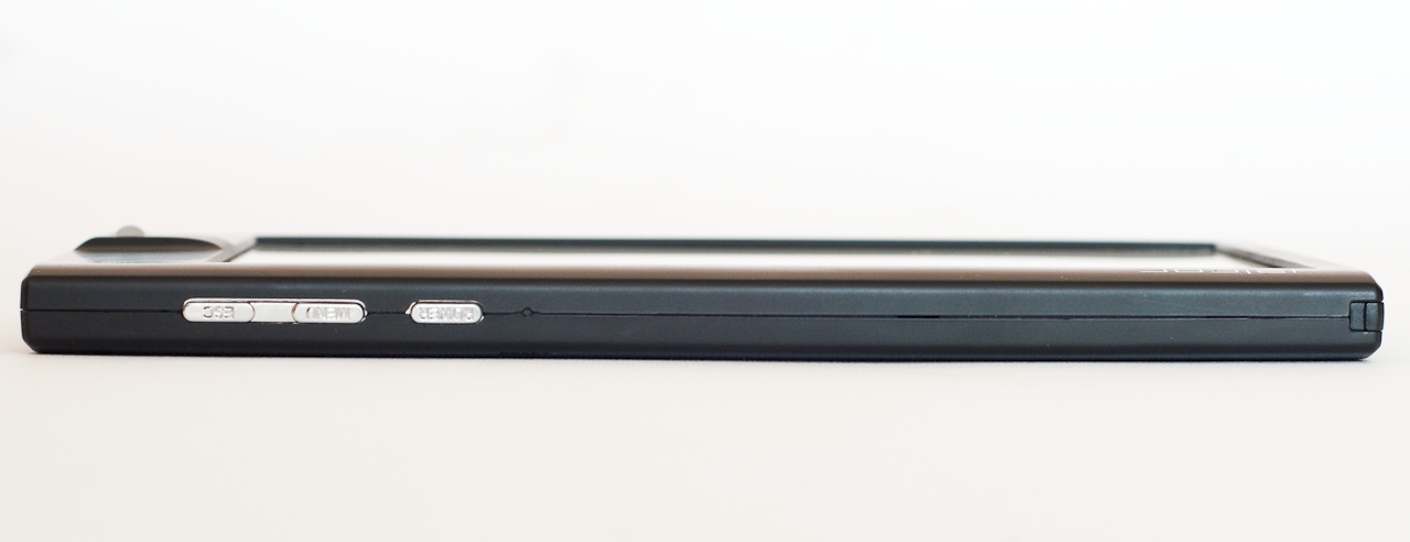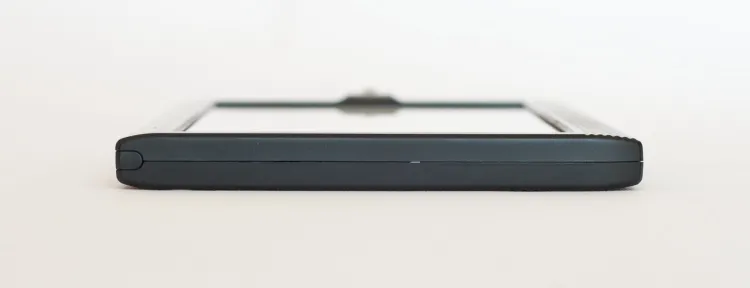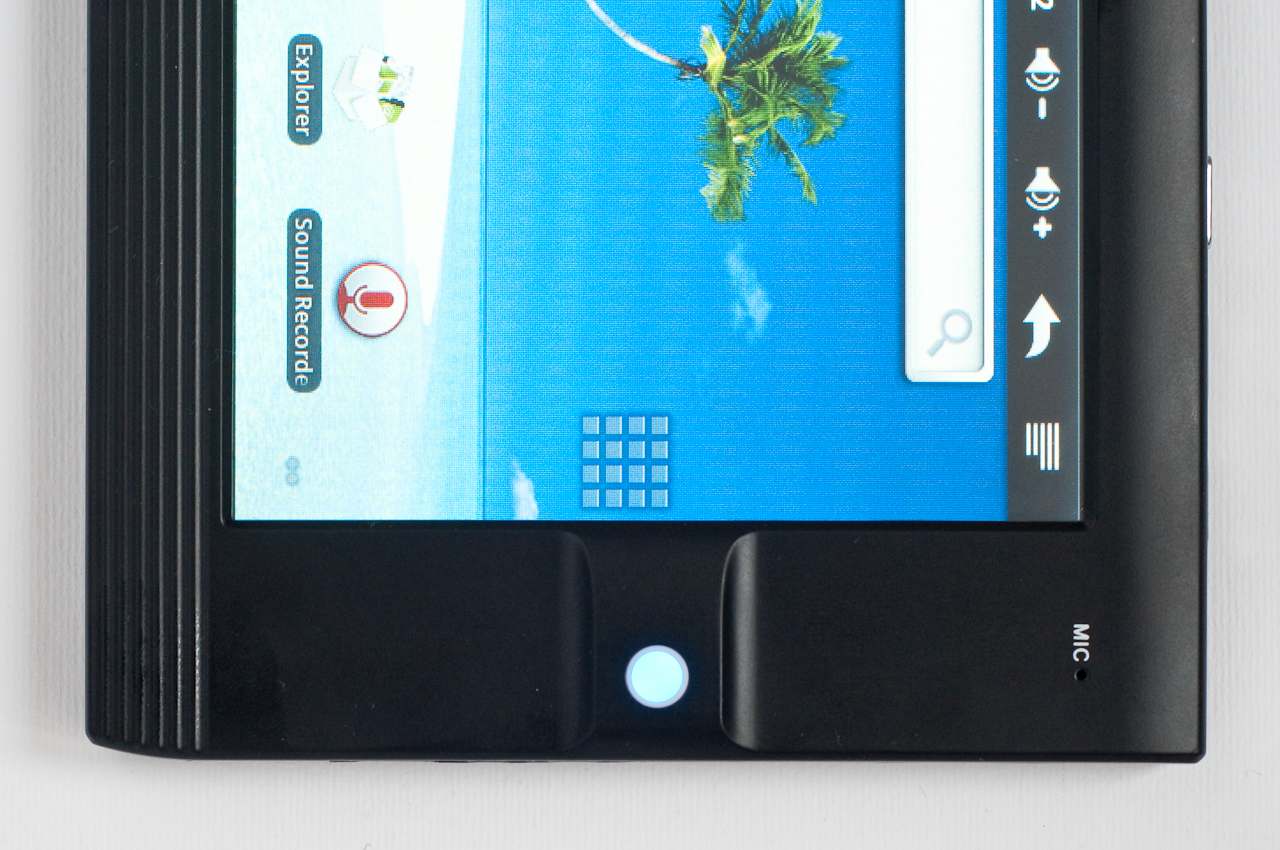 A 7”-os kijelző természetesen elfoglalja az előlap nagy részét, a körülötte található keret pedig átlagos méretű. Egyedül a jobb oldalon szélesedik ki, egyrészt azért, mert itt található a már említett trackball, másrészt azért, mert itt vannak a csatlakozók is, és ezeknek szükségük volt a helyre. Ezen a szélesebb részen felül van a beépített mikrofon nyílása is, ami például VoIP hívások alatt jöhet jól – vagy akkor, ha diktafonként akarjuk használni a készüléket.