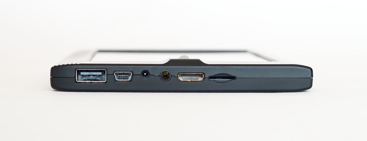 A készülék alsó és bal oldali éle teljesen üres, a csatlakozókat kivétel nélkül a jobb oldalon helyezték el. Ezek közül a legalsó egy USB host, amihez USB-s memóriákat csatlakoztathatunk (külső merevlemezzel csak akkor érdemes próbálkozni, ha saját tápellátása van), és elérhetjük a rajtuk található tartalmat, feltéve, ha nem NTFS fájlrendszert használunk, azt ugyanis nem olvassa az e-Pad. A következő csatlakozó egy standard USB port, amivel adatokat másolhatunk a készülék és egy számítógép között, majd a töltő, a fülhallgató, a miniHDMI csatlakozó és végül a microSD kártya nyílása következik. A külön töltőtől nem kell megijednünk, szerencsére az e-Pad USB-ről is tölthető, bár kicsit lassabban. A készülék egyébként átlagos méretű: 188×116×12 mm-es, súlya a sok műanyagnak köszönhetően mindössze 330 gramm.