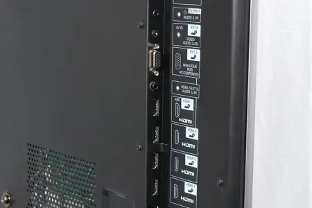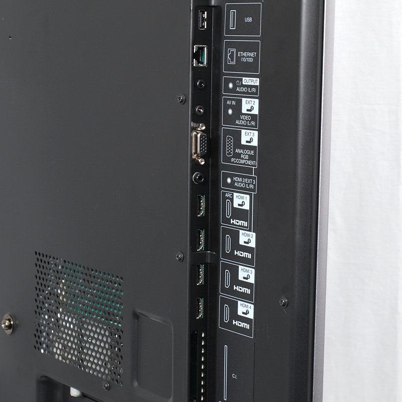 A HDMI csatlakozók mindegyik oldalra került (összesen 4 van, közülük az 1-es támogatja az ARC-t, a kettes számúhoz pedig sztereo audio kimenet is tartozik). Ezeken a csatlakozókon kívül ide került még az USB port és az Ethernet csatlakozó, az AV bemenet és egy fülhallgató kimenet valamint a CI kártya foglalata. Lefele a SCART, a D-Sub/YPbPr dugaszok, az analóg/DVB-T/C antenna és (külön) a DVB-S antenna valamint az optikai hangkimenet néznek.