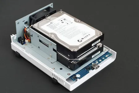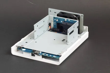 A készülékházat kinyitva egy egyszerű, fémlemezből hajlított tartószerkezet tárul elénk, ebbe kell becsúsztatni, majd 4-4 csavarral rögzíteni a merevlemezeket – éppen úgy, mint ahogyan azt egy rendes PC-s ház esetében tennénk.