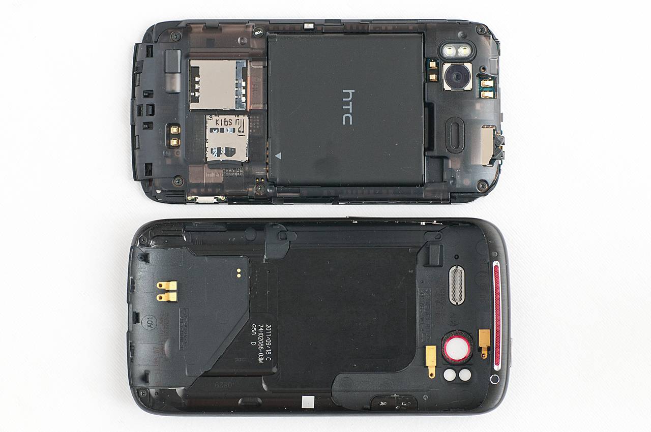 Ha megfordítjuk a Sensation XE-t, első ránézésre azt hihetjük, hogy a Legendhez és a Flyerhez hasonlóan különálló műanyag fedeleket kell majd leszerelnünk, ha hozzá akarunk férni az akkumulátorhoz vagy a SIM-hez. Ez azonban a Sensation XE esetében is csak átverés, itt az egész hátoldal leszedhető. Igaz, ez a hátoldal annyira körbefogja a telefont, hogy még a kijelző feletti rácsos részt is magában foglalja. Hátul láthatjuk egyébként a két LED-del felszerelt, 8 Mpixeles kameramodult is, mellette pedig a külső hangszórót.