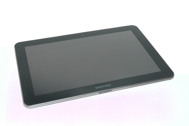 A készülék eleje nem meglepő módon nagy, sík felületet. A fekete keretbe foglalt 10,1”-os kapacitív érintőképernyőt Gorilla Glass üveg védi, meglehetősen jól. Ha nem is sokkal, de nagyobb lett Tab 10.1 előlapja a 10.1v előlapjánál – ami nem a kijelzőnek, hanem a vastagabb keretnek köszönhető – kézbe véve a táblagépet a méretváltozás nem feltűnő. A keretet oldalról a készülékház szürke színű csíkja zárja le, amely a készülék oldalához tartozik. A nagy méretű kijelző felett található a 2 Mpixeles előlapi kamera, mellette pedig fényérzékelő szenzor rejtőzik.