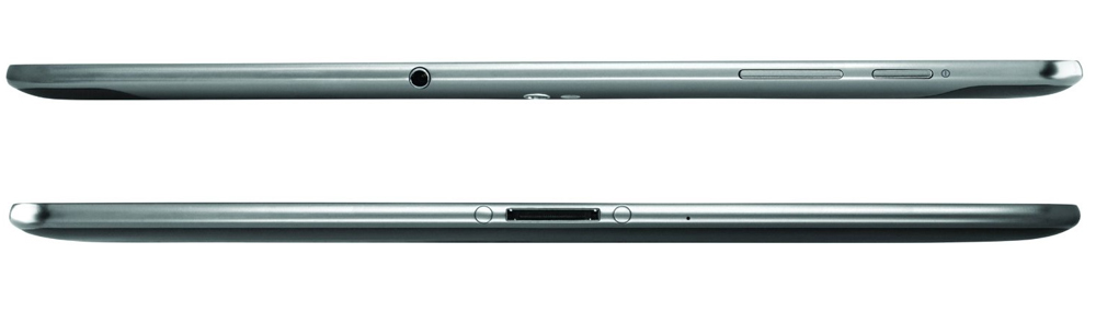 Oldalt szürke keret fogja körbe a készüléket: ennek két oldalán egy-egy bemélyedés rejti a hangszórókat. Alulra került a már-már hagyományosnak mondható Samsung táblagép csatlakozó, amelyen keresztül a készülék tölthető, dokkolható, vagy számítógéphez köthető.