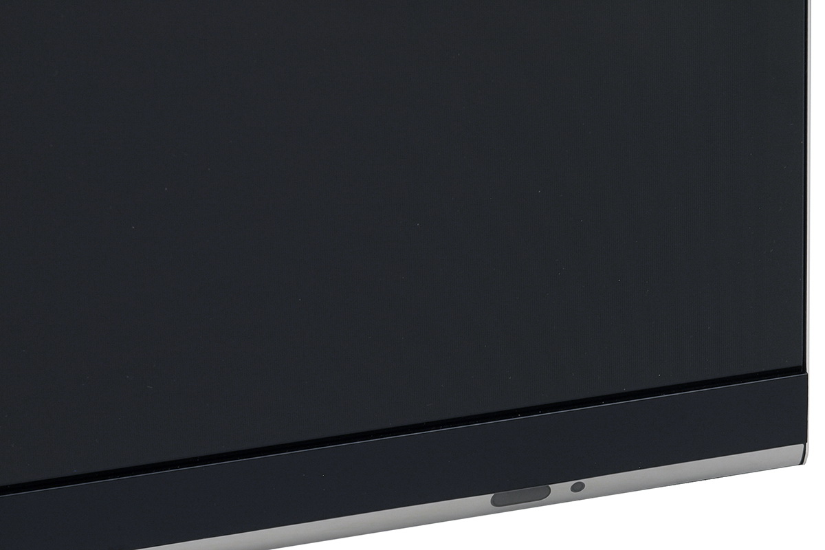Ahogyan korábban már említettük, a 6-os és 7-es sorozat kávája csak az alsó részben tér el; míg a 7-es szériánál ez a felület teljesen fekete és lapos, addig tesztünk alanyánál az alsó, kb. fél centiméteres sáv ívelt felület, világos és tükröződik. Ízlés kérdése, hogy kinek melyik jön be jobban – mindkettő szerethető. Funkcionálisan ez a sáv természetesen semmilyen módon nem játszik szerepet de vékonyabbnak mutatja a káva alsó felét. Ez a sáv tartalmazza egyébként a visszajelző LED-et, és az érzékelőket (távirányító, külső fényerősség) is. Az LG a feliratok esetében a minimumra szorítkozott, egyedül a márkajelzést találjuk meg a káván (természetesen lent, hiszen a hagyományos értelemben véve csak itt van káva).