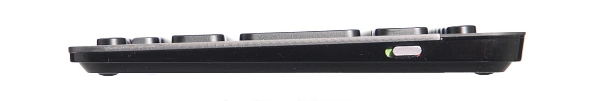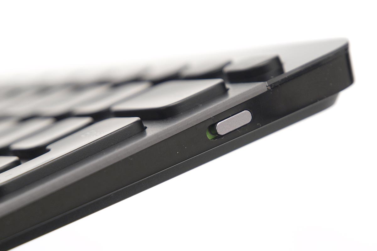 Hátul találjuk a töltéshez (és csakis a töltéshez használatos) microUSB portot, jobb oldalt pedig egy hardveres kapcsolót, amivel a klaviatúrát teljesen ki tudjuk kapcsolni.