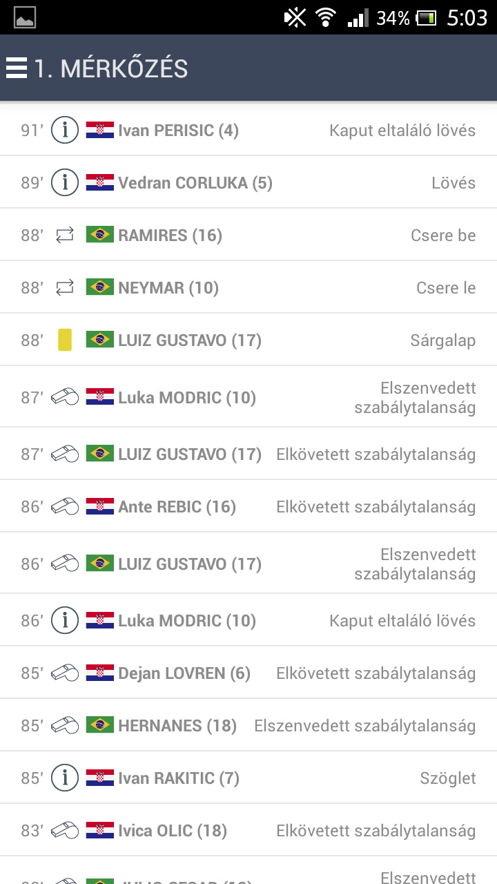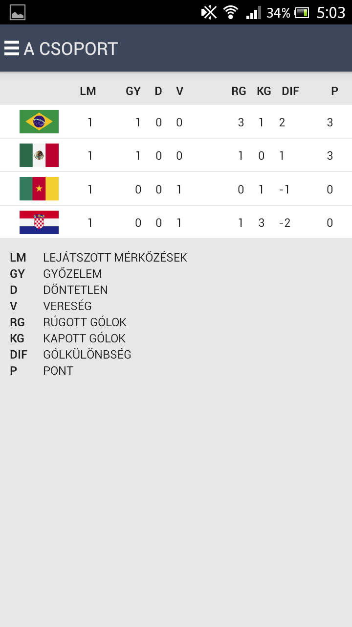 A FIFA hivatalos alkalmazása remek, de csak azoknak, akik tudnak angolul. Szerencsére van magyar nyelvű alternatíva – több is. Elsőként az Origo fejlesztésében készült Foci-vb 2014 alkalmazást választottuk ki, amelynek megvan az az előnye, hogy az Origo teljes (kapcsolódó) híranyagához is hozzáfér, így ez az app sem egy sablonos, pusztán a menetrendre, az eredményekre meg a tabellára koncentráló szoftver. Azt persze nem tudjuk, hogy a lap mennyire részletesen foglalkozik majd az eseményekkel, de korábban nem volt panasz a közvetítésekre, így a tartalmi rész vélhetően ismét rendben lesz (és ezt az első nap eseményei alapján továbbra is így gondoljuk).