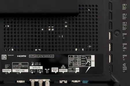 Csatlakozók és adapterek szempontjából a kínálat teljes: kapunk 4 HDMI csatlakozót (1×HDMI 2.0, 3×HDMI 1.4a) és egy DisplayPort bemenetet, 3 USB csatlakozót (1×USB 3.0, 2× USB 2.0), optikai hangkimenet, jack hangkimenet, SD és CI slotokat, D-Sub, komponens/kompozit, Ethernet csatlakozókat és 2 DVB-S valamint 1 DVB-T/C bemenet. Tunerből összesen hét áll rendelkezésre: az analóg mellett minden digitális szabványhoz kettő került beépítésre. A készülék fentieken túl WiFi és Bluetooth adaptereket is tartalmaz.