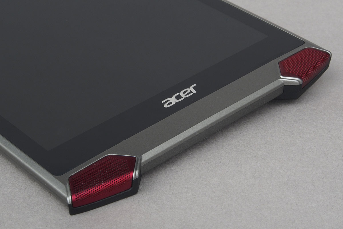 A kijelzővel persze nem lehetett variálni, de ennek környékét is sikerült feldobni pusztán azzal, hogy az LCD-t körülölelő fekete keret nem éri el a masina szélét. Igazán azonban a hangszórók száma és elhelyezkedése az érdekes: hangkeltőből négyet kapunk, amelyek a tablet sarkaiba kerültek. Egyébként az előttük lévő rácsok bordó színe révén ezek adják meg a Predator jelleget is a kütyünek. A felépítés, talán mondanunk sem kell, szimmetrikus, hiszen egy tabletet fektetve és állítva egyaránt szokás használni. A Predator 8 esetében valószínűleg a fektetett helyzet lesz inkább gyakori, mivel a játékok többsége, a filmek és az internetezés is ezt a pozíciót kívánja meg.