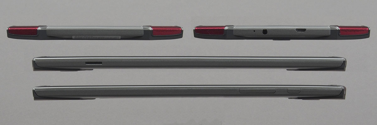 A kijelzőt (de nem a teljes előlapot) karcálló, de meg nem nevezett üveg borítja, a hátsó részen pedig fémet és műanyagot is találunk. A középső rész fémből készült, oldalt viszont műanyagot kapunk, hogy az antennák kilássanak. Illetve a képen a fekete színű V alakú területek szilikonosak, hogy amikor játszunk, akkor is stabil legyen a kütyü fogása. Részben ez is okozza, hogy a tabletet kényelmes tartani, bár a mutató ujjunkra érdemes azért figyelni, mert a hangszórók hátsó része picit szúr – ezt a területet nyilván el kell kerülni.