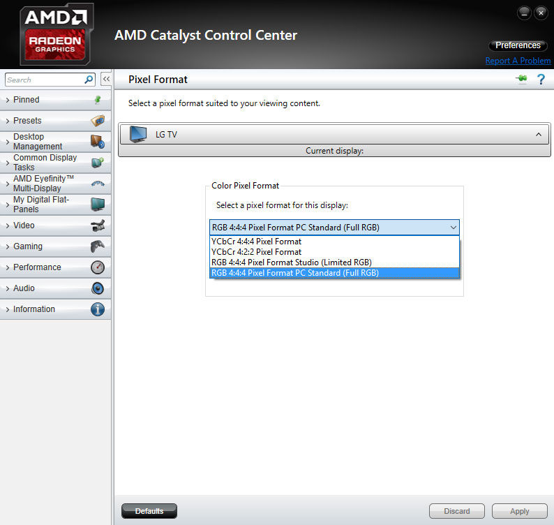 AMD GPU esetében a kimeneti formátumot a Catalyst Control Centerben, a My Digital Flat-Panels/Pixel Format útvonalon találjuk meg; válasszuk ki az RGB 4:4:4 Pixel Format PC Standard (Full RGB) lehetőséget, a tévén pedig Magas fekete szintet állítsunk be. (Ezzel egyenértékű lehet az YCbCr 4:4:4 Pixel Format lehetőség, amennyiben a tévé támogatja ezt a típusú jelet.)