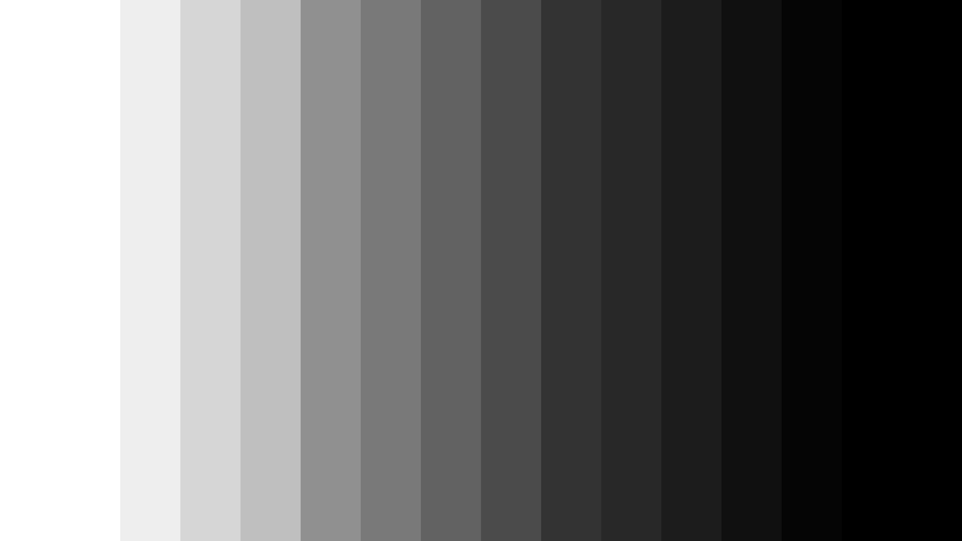 Ha a tévé Full RGB jelet ad ki, a tévé viszont limitált RGB jelet vár, akkor az alábbi kép fogad majd: azt kell figyelni, hogy nemcsak az első, hanem a második oszlop is teljesen fehér, és nemcsak a tizenhatodik, hanem a tizenötödik oszlop is teljesen fekete. Ebben az esetben a tévén kell módosítani a fekete szint beállítást Magas-ra.