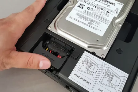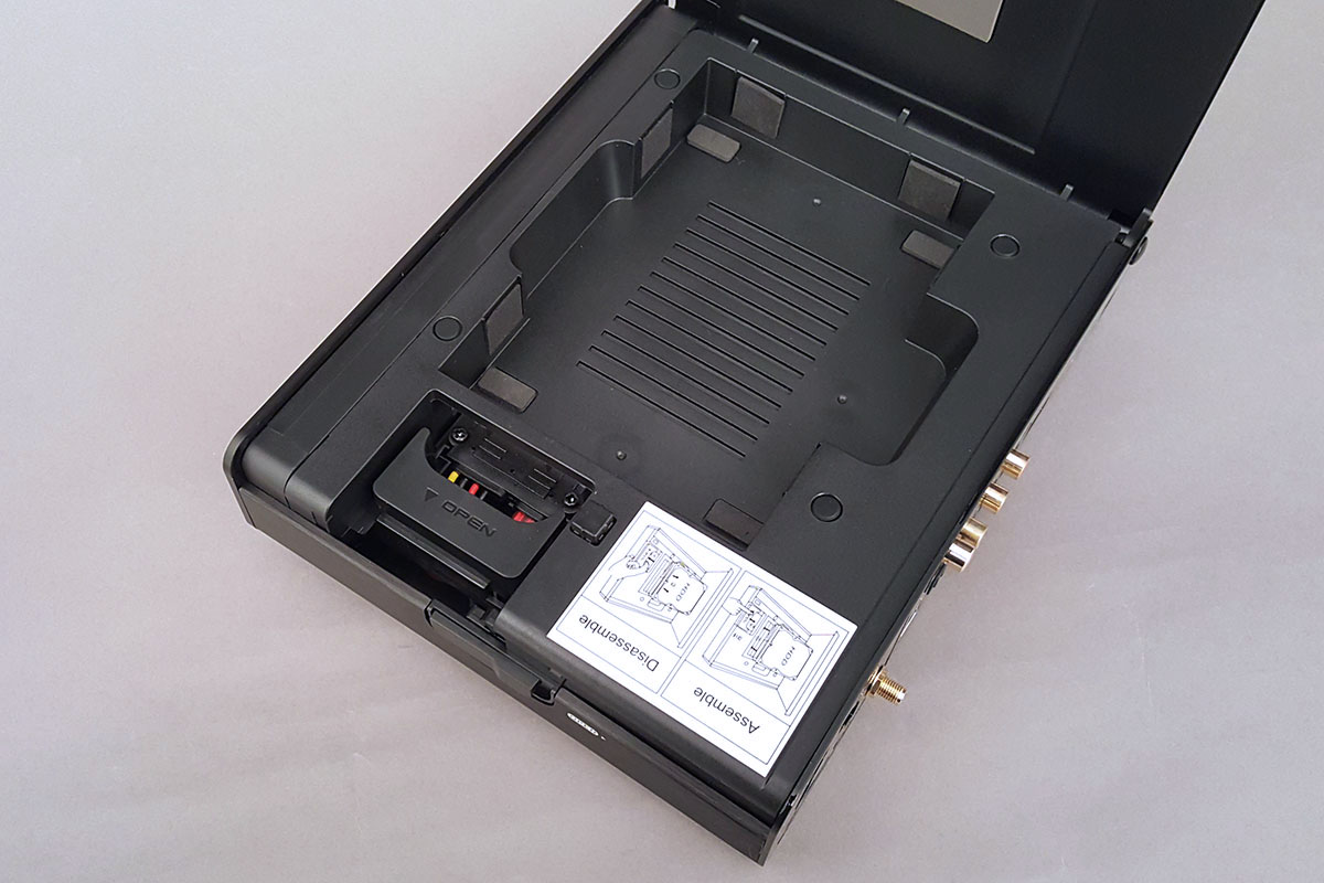 A nagy fizikai méretből talán sejthető, hogy a lejátszóba akár 3,5 colos merevlemezt is be tudunk építeni – sőt, igazából csak azt, mivel a gyártó olyan keretet, ami a 2,5 colos egységek beépítését könnyítené meg, nem mellékelt. Ettől persze még lehet ilyen keretet utólag venni (vagy barkácsolni otthon), ha valakinek mindenképpen a kisebb helyet elfoglaló adattárolóra lenne szüksége. A beépítés nem bonyolult, és csavarozás nélkül megoldható.