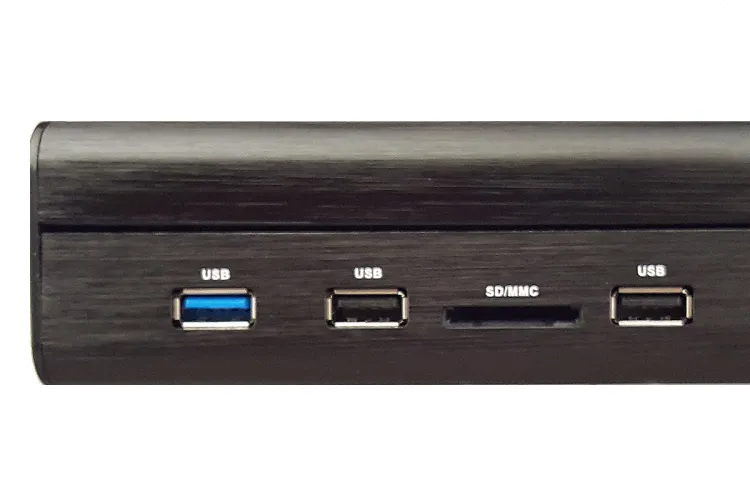USB-host hátul nincsen, bal oldalt viszont rögtön három ilyen interfészt is találunk, és közéjük még egy kártyaolvasó is befért. A tápcsatlakozó ennél a modellnél külső, az átalakító pedig a dugóval van egybeépítve.