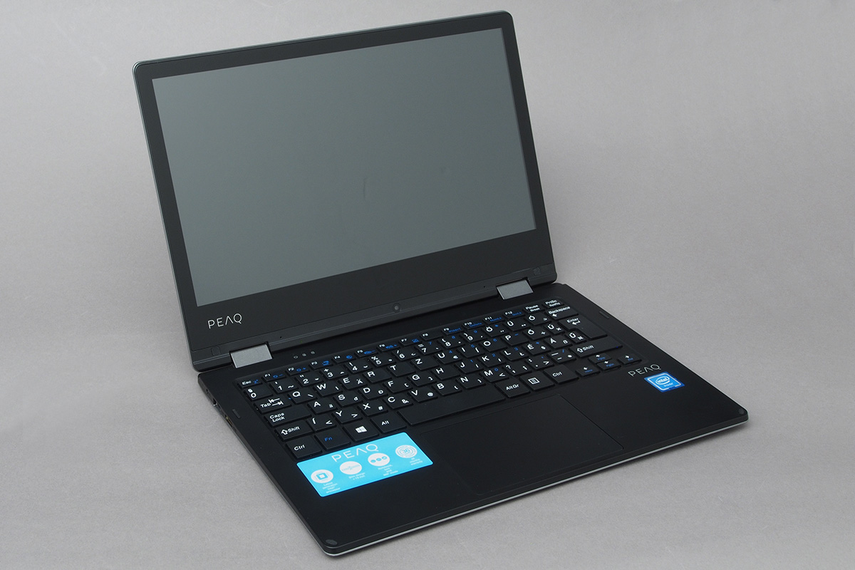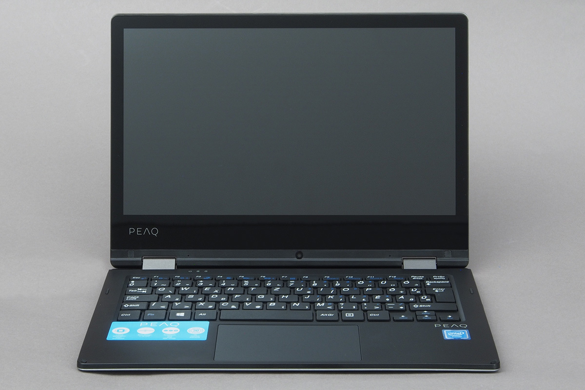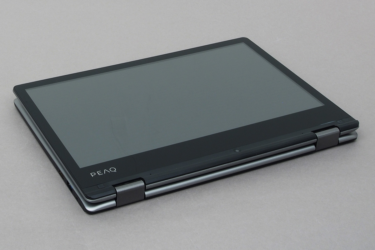 A kijelzőt és a gépet a szokásos módon két darab dupla forgáspontos zsanér tartja, amelyek szorítása annyira erős, hogy egy ujjal (vagy akár egy kézzel) esélyünk sincs kinyitni a notebookot. Ezt viszont nem feltétlenül kell felróni a PEAQ-nek, mert így legalább a 360 fokban kihajtott LCD is tökéletesen stabilan a helyén marad. Az összeszerelés minősége jó, de nem tökéletes. Illesztési hibák nincsenek, viszont a gépet nem igazán lehet úgy megfogni, hogy valamiféle recsegő-ropogó hangot ne adjon ki magából.