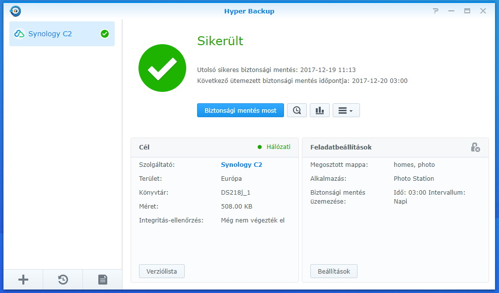 A Synology a C2 Backup szolgáltatással pontosan ezt a lehetőséget kínálja fel: a gyártó saját NAS készülékein lévő adatokról készíthetünk vele egy extra biztonsági mentést. A Synology a szolgáltatást előfizetéses alapon nyújtja, amelynek ára attól függ, hogy mennyi tárhelyet szeretnénk igénybe venni. 100 GB, 300 GB és 1 TB az elérhető opciók, ezek évi 10, 25 illetve 60 euróba kerülnek. Otthonra bőven elég ekkora kapacitás, kisvállalkozások viszont megfontolhatják, hogy 70 euró/TB/év alapon akár 10 TB-nyi helyet is béreljenek.
