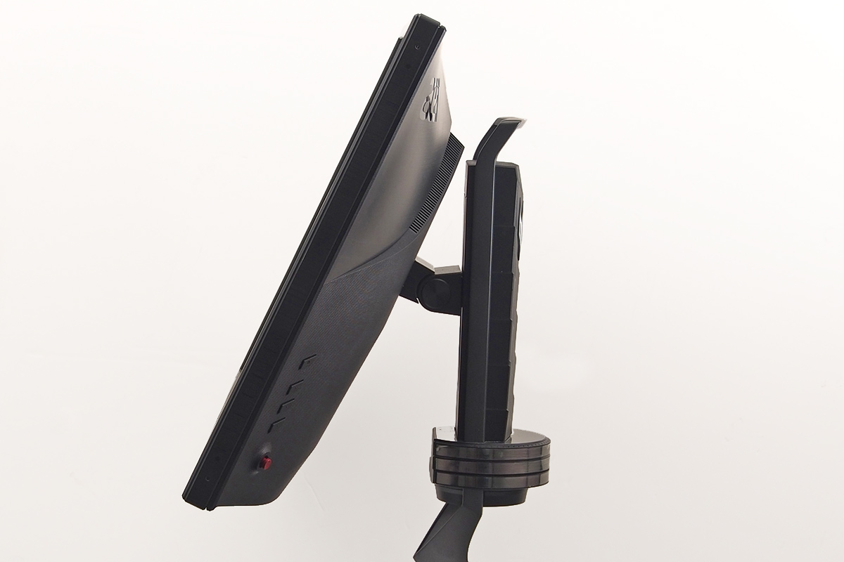 Maga a monitor nem túl különleges tehát, még a Predator szériája jellemző piros szín is szinte teljesen hiányzik róla. A talp viszont érdekes; V alakú, a „nyak” részén ugyanakkor egy hatalmas csukló is található, amely az elforgatást teszi lehetővé. Nem mintha erre olyan nagy szükség volna (hiszen a monitort el lehetne forgatni egyszerűen úgy is, hogy felemeljük picit), de tény, hogy az a megoldás egyedülálló. A forgatás mindkét irányban 20 fokban lehetséges, emellett a kijelzőt dönthetjük (előre 5, hátra 25 fokban) valamint akár 13 cm-rel is megemelhetjük. Az Acer árnyékoló lapokat is ad a monitorhoz – ezeket a kávára lehet felcsavarozni, ha úgy gondoljuk, hogy szükség van rájuk.