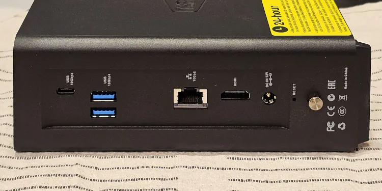A fontos dolgok ezúttal is a hátlapra kerültek. Lentről felfelé haladva az első dolog egy kézzel kitekerhető csavar, ennek eltávolítása után lehet kihúzni a belső részt az O alakú külső burkolatból. Utána következik a tápcsatlakozó, majd a HDMI és az Ethernet. A sort három USB port zárja, kettő USB-A, egy pedig USB-C csatlakozót használ. Az Ethernet 10 Gbps-os sebességre, azaz elméletben 1250 MB/s-os adatátvitelre képes, mint ahogyan az USB-csatlakozók esetében is ez az elméleti maximum. Ha valamiért a gyári állapotra kellene visszaállni, akkor ahhoz a csavar és a tápcsatlakozó közötti Reset gombot lehet használni, ami – szokás szerint – csak tűvel nyomható be.