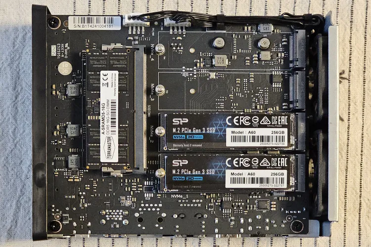 A NAS lelke egy Intel Core i3 N305 processzor, amely asztali gépben nem lenne egy nagy eresztés, NAS-ba viszont nagyon erős választásnak számít a maga 3,8 GHz-es maximális működési frekvenciájával és 8 magjával úgy, hogy közben még csak nem is fogyaszt sokat: TDP-je 15 watt. Ez kevesebb, mint a NAS-okban oly kedvelt AMD V1500B, annak ellenére, hogy az Intel chipje majdnem kétszer gyorsabb! Cserébe viszont csak 9 PCIe sávot támogat, így ahhoz, hogy a 10 Gbps-os sebességet az Ethernet és az USB csatlakozók is kihasználhassák, egy trükkre volt szükség: az Ethernet és az USB vezérlő számára az alaplap két-két sávot biztosít, az első négy M.2 foglalat mindegyike saját PCIe sávot kapott, a második négy foglalat pedig egy ASMedia ASM2806-on keresztül csatlakozik a kilencedik PCIe sávhoz. Számukra tehát a vas jóval alacsonyabb elméleti sebességet biztosít – igaz, a gyakorlatban az eltérés legfeljebb nagy fájlok mozgatásakor érezhető, és akkor sem túlzott mértékben. Hiszen a négy SSD-re jutó 8 Gbps csak 20 százalékkal alacsonyabb annál, mint amit a 10 Gbps-os Ethernet port elméletben nyújtani tud. Ebből adódik egyébként az is, hogy semmi szükség arra, hogy a leggyorsabb SSD-ket vásároljuk meg a NAS-ba, tökéletesen elegendő lényegében bármilyen olyan PCIe 3.0 támogatással rendelkező modell, ami képes 1 GB/s-os sebességre olvasás és írás esetén egyaránt. Így azért elég sokat lehet spórolni.