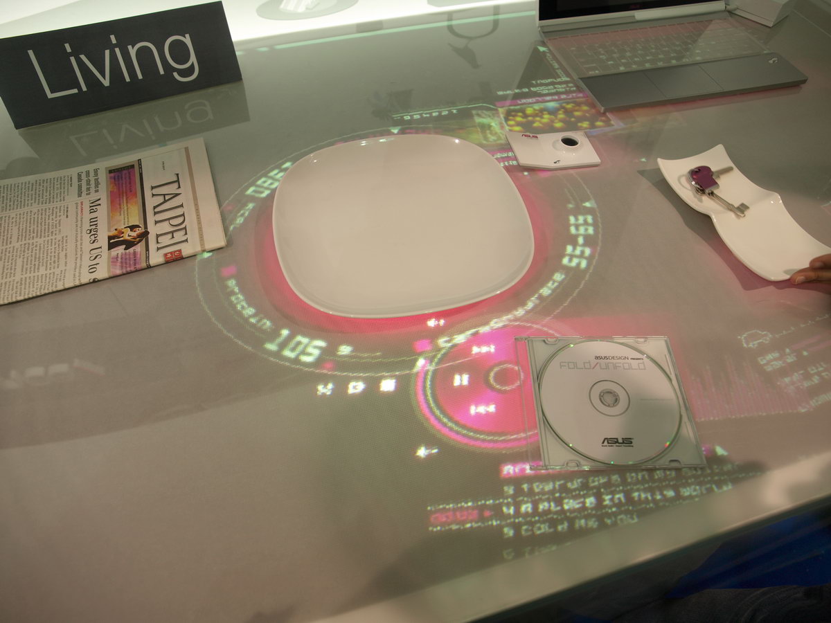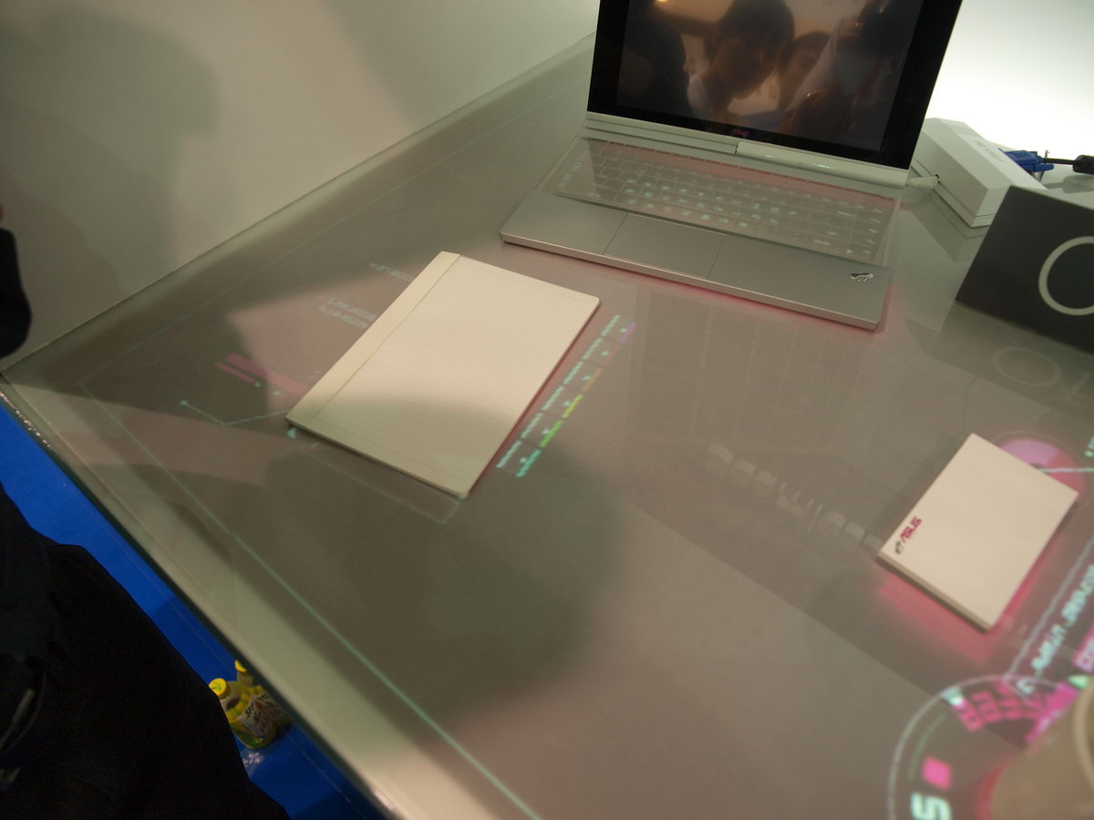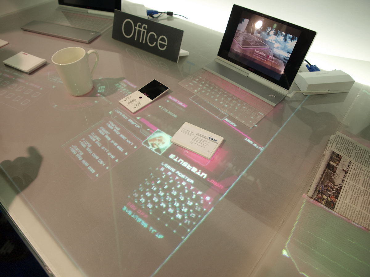 Néhány példa: ha letesszük a jegyzettömböt az asztalra, akkor a rendszer először is felismeri, hogy az a jegyzettömb, majd megkeresi, hogy a rendszerben milyen releváns infók vannak. Például teendők, találkozók, bevásárló lista, stb. Ezeket rendszerezi, s a jegyzettömb köré vetíti nem zavaró módon, könnyen átlátható formában. Az ASUS megoldása okos, ha például odébb visszük a füzetet, akkor azt a körérajzolt keret is követi: ez az utolsó két képünkön jól nyomon is követhető. A mobiltelefon „mellett” például a kontaktlistában kereshetünk, ha két notebookot teszünk az asztalra, akkor pedig mindenféle egyéb teendő nélkül létrejön közöttük a kapcsolat, és akár az adatok szinkronizálására is sor kerül. Ha leteszünk egy CD-t az asztalra, azt természetesen lejátszani nem tudjuk, de a rendszer tudni fogja, hogy most zenét szeretnénk hallgatni, stb… A Seamless Experience erőssége az ASUS szerint pedig éppen abban rejlik, hogy mivel képes felismerni a tárgyakat, azért mindig az aktuális környezethez legjobban illő opciókat tudja használójának mutatni. Ha úgy tetszik, egy olyan felhasználói élmény van kialakulóban amikor a mivel és hogyan helyett valóban csak a mit (akarunk csinálni) lesz a kérdés.