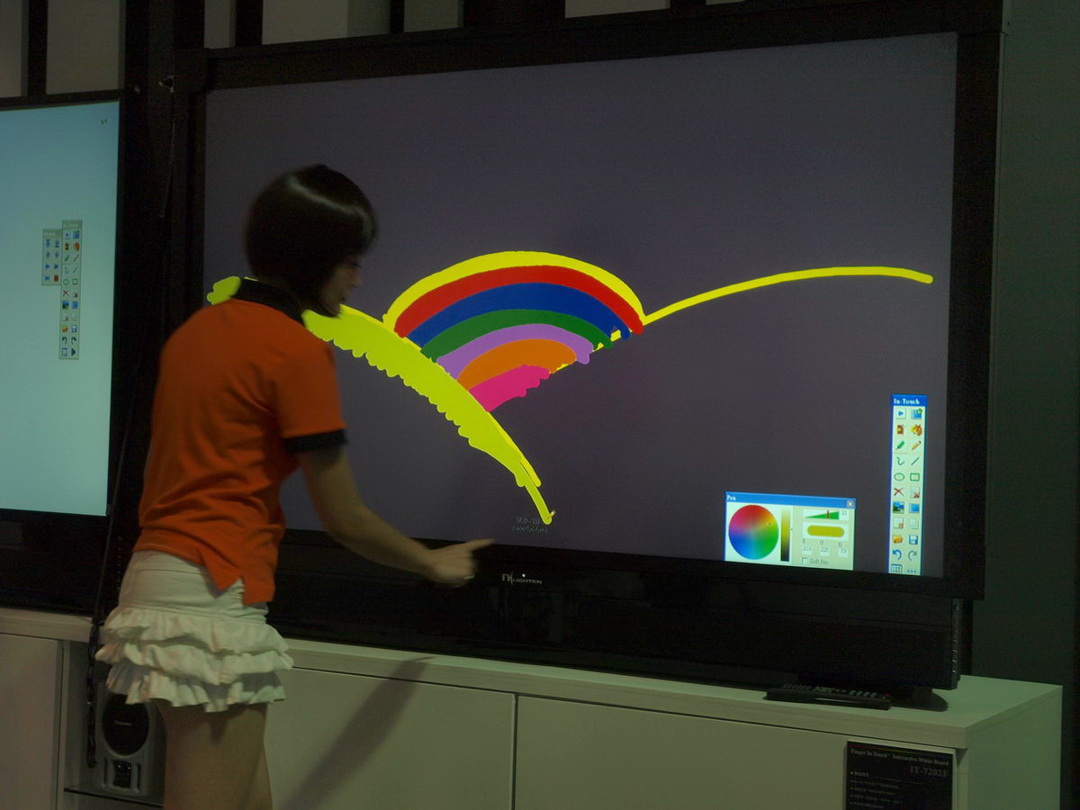 Igazából egymás hegyét-hátát érték a mindenféle érintőképernyőket árusító cégek, amelyek olykor csak a panelt, máskor teljes megoldásokat állítottak ki. Túl nagy különbség értelem szerűen nem volt az alapmodellek között, ezért erős szelekció után két gyártót választottunk ki. Az egyik az nLighten, amely alapvetően hátulvetítős megjelenítőkre épít, viszont ezekből a közepes és a nagyon nagy méret között mindenféle típust. A legérdekesebbnek az IT-7202F jelzésű készüléküket találtuk, amely egyszerre sok ponton képes érzékelni, ha megérintik, és az egyes területeket lokalizálva is tudja értelmezni.