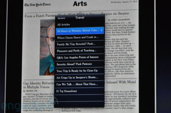 Steve Jobs a kezelőfelületet demózza - az Engadgetnek sikerült is megfigyelnie, hogy a Flash-támogatás most is hiányzik a böngészőből, de ettől eltekintve a készülék remekül használható, mint netes eszköz. A multitouchos érintőképernyővel iPhone-szerűen, gesztusokkal vezérelhető.