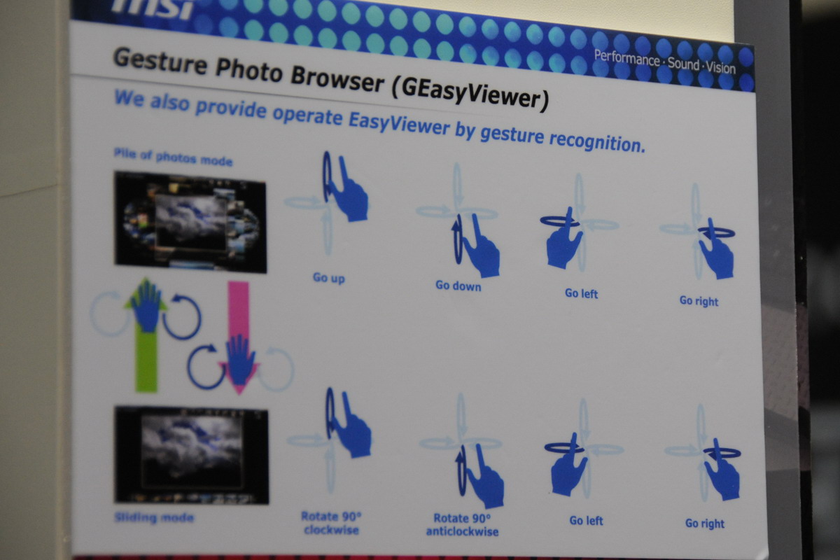 Az MSI-nél meg egy érdekességet láttunk. Aki olvasta tavalyi CES-es tudósításunkat, az találkozott már a Minoru nevével, ez a cég készítette el a világ első 3D-s webkameráját. Az MSI-nél ezt a típust gesztusok érzékelésére használják fel, az egyelőre még erősen prototípus stádiumban lévő (de azért már annyira, hogy mutogatni lehessen, jó állapotban lévő) szoftverrel képeket (diavatítést) lehetett nézni, és a megjelenő fotókat karmozdulatunkkal tudjuk kicsinyíteni, nagyítani.
