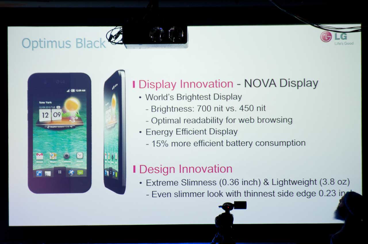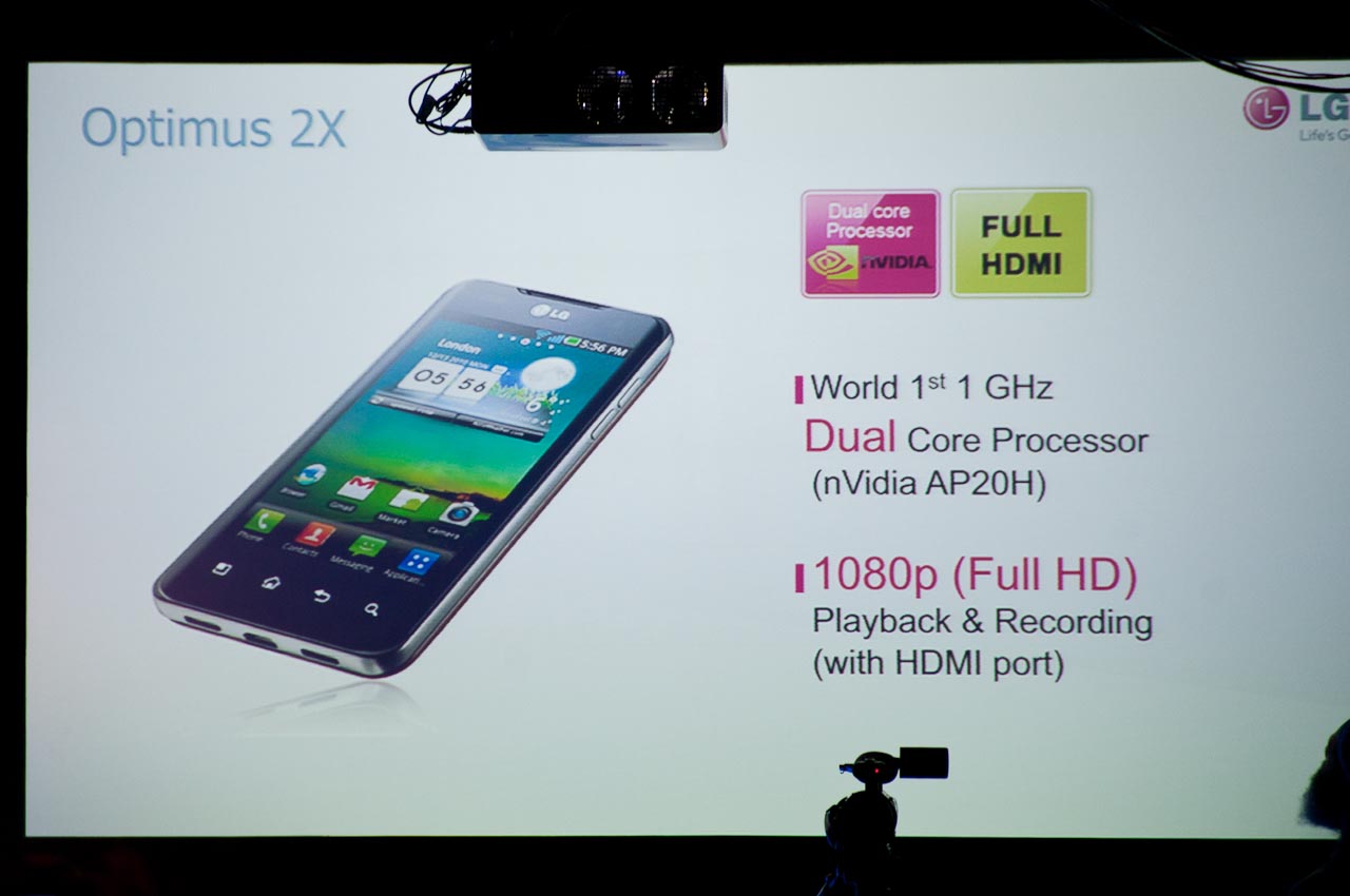 A mobilok között is volt több érdekesség, de ezek sem hatottak az újdonság erejével: az LG bejelentette az Optimus 2X-et, ami a cég állítása szerint a világ első kétmagos processzort tartalmazó telefonja. Az Optimus 2X ezzel akár Full HD videók lejátszására is képes, a képet és a hangot pedig HDMI-n keresztül tudja kiadni. Érkezik a nagyon vékony és könnyű, 9,2 mm vastag és 107 grammos Optimus Black, NOVA kijelzővel: a panel a 700 cd/m²-es fényerejének hála nappal is kitűnően látható.