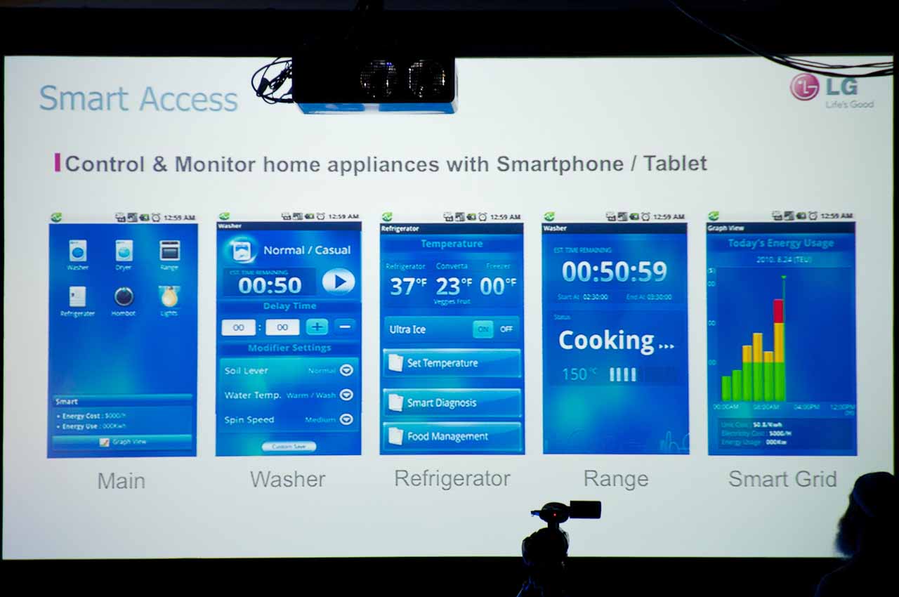 Háztartási eszközöket először hoz a CES-re az LG, a Smart Grid koncepciót már a CEATEC 2010-en is rengeteget láttuk, ez most az LG-nél is visszaköszön: a 2011-es hűtők, sütők, mosógépek és robotporszívók WiFi kapcsolaton keresztül bármilyen okos eszközzel (mobillal, tablettel vagy PC-vel) tudnak kommunikálni, adatot cserélni (pl. új programok,, recepteket letöltése, mennyi idő van hátra a sütésből, fogyóban van-e a tej, stb.) A robotporszívó még érdekesebb, ezt tudja az előlapi kamerája képét is továbbítani a WiFi hálózaton keresztül.