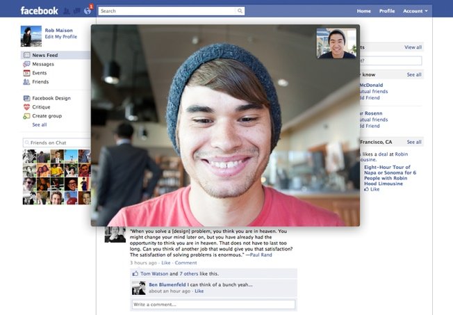 A Skype-pal közösen készített projektet a facebook.com/videocalling oldalon tudjuk behívni, majd a Get Strarted gombbal lehet aktiválni a szolgáltatás. Ez egy alkalmazás letöltését és telepítését jelenti. Ezután a már megszokott chat ablakban, ha kiválasztjuk egy elérhető ismerősünket, a fejlécben megjelenik egy kamera ikon, ezze kezdeményezhetünk videohívást, amennyiben ehhez megfelelő böngészőnk, illetve webkameránk van. A vonal másik végén megcsörren egy ablak, amely jelzi, hogy videochatelni szeretnénk. Miután ezt elfogadta ismerősünk, már el is indul egy külön ablakban a videotelefon.