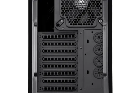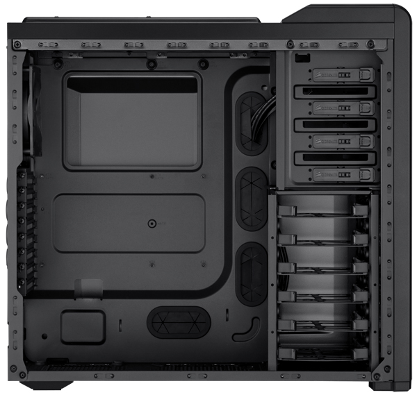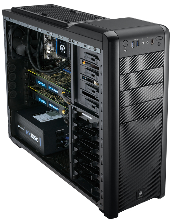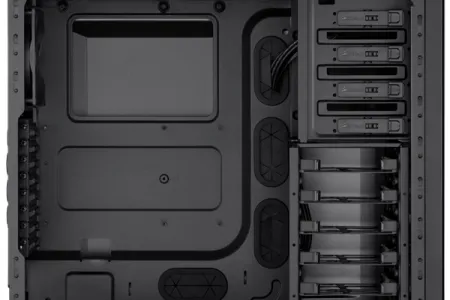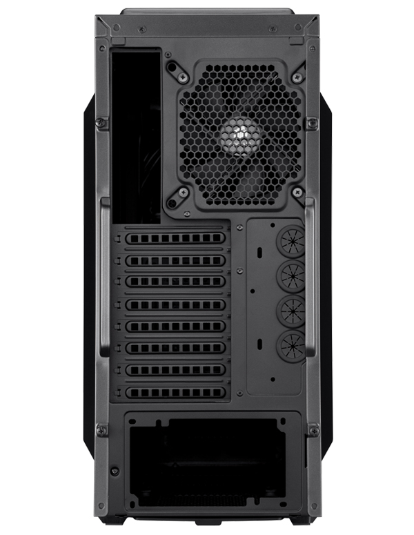 A nyolc darab hátlapi bővítő helyre kényelmesen elfér több felsőkategóriás videokártya is, amelyek akár 316 mm hosszúsággal is rendelkezhetnek. A belső, 3,5"-os tárolók mellett természetesen már 2,5"-os SSD fogadó hely is elérhető, ahogy azt egy mai gamer konfiguráció meg is követeli. Az előlapon USB 3.0 és FireWire csatlakozókat is találhatunk a szokásos audio aljzatok mellett.