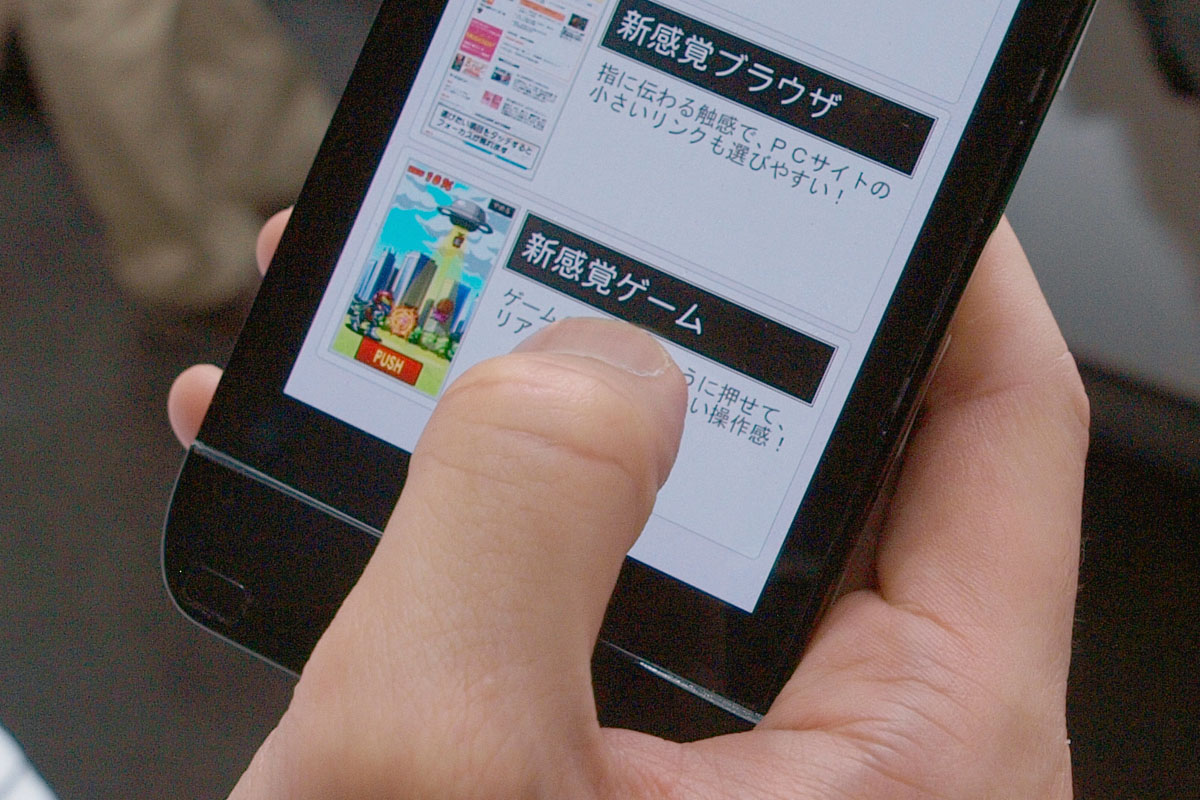 A KDDI már hónapokkal ezelőtt hírt adott erről a fejlesztéséről, ám kipróbálni csak most volt módunk, lássuk a tapasztalatokat. A New Touch Feeling Smartphone néven futó fejlesztés célja kettős, egyrészt a vezérlést szeretné hatékonyabbá tenni a szolgáltató, másrészt elérni, hogy az érintőképernyő kezelésekor is kapjunk (a vibráláson kívül) fizikai visszajelzést. A prototípuson első látásra semmi különleges nincsen, a turpisságra csak akkor derül fény, ha elkezdjük nyomkodni a mobilt, merthogy érintésre semmi nem történik, ha az ujjunkat húzkodjuk a panelen, akkor kb. annyit érünk el, mint amikor az egeret mozgatjuk a számítógépen. Ha azt akarjuk, hogy történjen is valami, „meg kell nyomnunk” a panelt – amely nemcsak az érintés érzékelésére képes, hanem azt is meg tudja mondani, hogy mennyire erősen nyomtuk meg a telefon képernyőjét. Tulajdonképpen kattintani lehet tehát az ujjunkkal, amelyre érdekes válaszként a telefon az adott helyen „visszaüt” picit, így teljesen az volt az érzésünk, mintha egy valódi gombot nyomtunk volna meg.