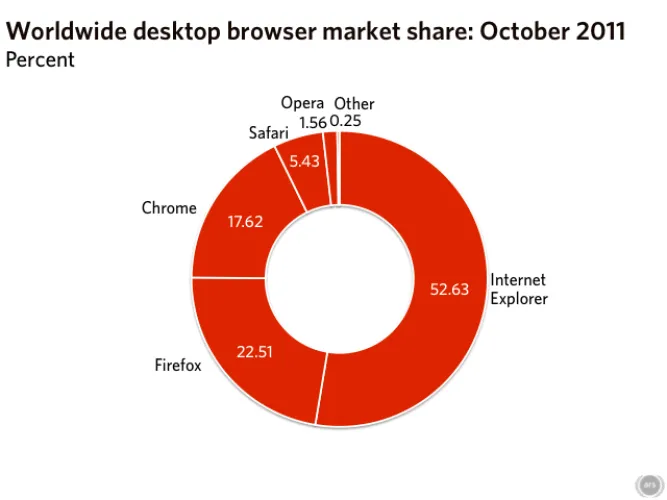 Hét évvel ezelőtt a böngészőpiac 95%-át uralta a Microsoft, a Net Applications legutóbbi jelentése szerint azonban – most először – 50% alá (49,59%) esett az Internet Explorer részesedése globálisan. Az IE gyengülésével párhuzamosan a Chrome nagyon megerősödött, 16,6%-os eredménye a harmadik helyre volt elegendő, míg a második helyen jelenleg a Firefox található, 21,2%-os share-rel.