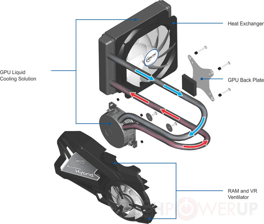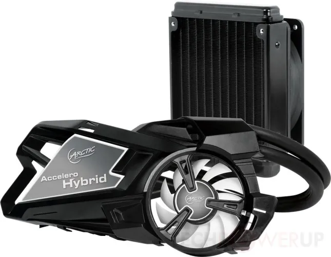 Az Accelero Hybrid két részből áll, az egyik fele egy zárt folyadékhűtés, amely egy GPU blokkból és egy (külső) radiátorból (hőcserélőből) áll, a kettő között pedig természetesen folyadék szállítja a hőt. A másik fele egy ventilátorral rendelkező egység, amely a blokkra helyezhető, és a kártyán található memóriamodulokat illetve VRM modulokat tartja hűsen – a vízhűtéseknél elég gyakori gond, hogy, bár a GPU hűvös marad, a memóriák és a feszültségszabályozó modulok túlmelegednek, az Arctic azonban gondolt erre is. Légkavaró a radiátoron is található, ez egy 120 mm-et egység, amelyet természetesen az Arctic saját maga gyárt.