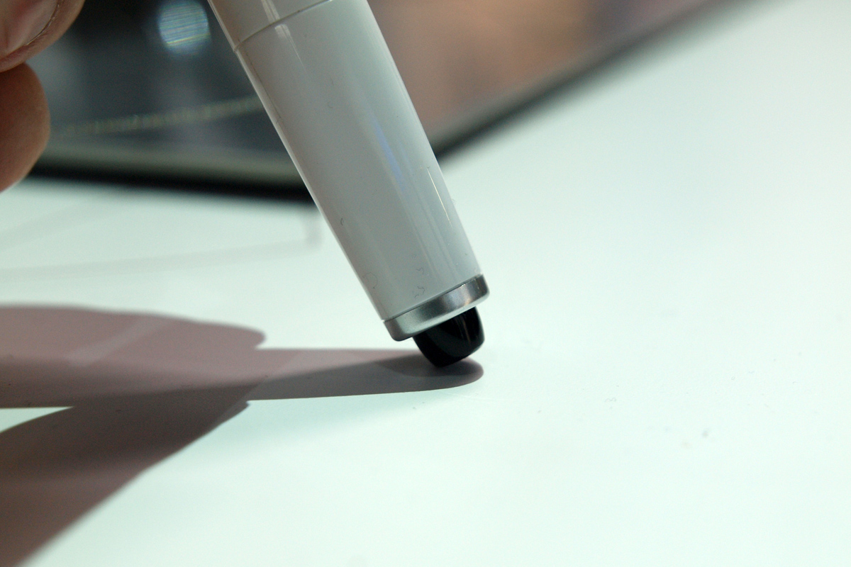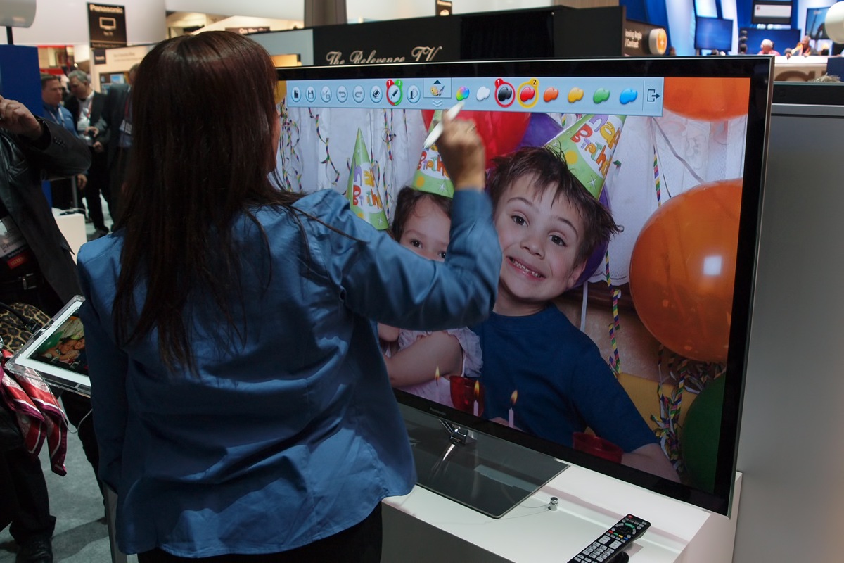 A sajtótájékoztatón figyeltünk fel az elektronikus tollra, működéséről akkor azonban még semmit sem lehetett tudni, ezért elszaladtunk a Pansonichoz, és kipróbáltuk az eszközt. A fehér, meglehetősen vastag stylus vezeték nélkül kommunikál a tévével, legnagyobb érdekessége pedig talán az, hogy a Panasonic összes idén bejelentett Full HD felbontású tévéjével kompatibilis, azaz a ZT60, VT60, ST60 és S60 sorozatokkal egyaránt használható. A digitális toll vége nyomásérzékeny, így lehet vele klikkelni – viszont a „pöcök” csak kétállású, a technológia arra egyelőre nem képes, hogy a nyomás erősségét is érzékelje. A Panasonic hagyományos, kapacitív érintőképernyőt használ, amelyet minden plazmatévé tartalmaz.