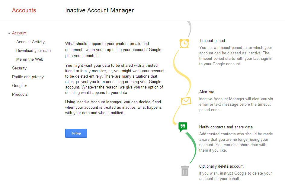 A szolgáltatást a Google ennyire azért nem explicit reklámozza, a hivatalos verzióban azt lehet megadni, hogy mi történjen adatainkkal, ha nem használjuk többé a felhasználói fiókunkat – a szolgáltatásra a legnagyobb eséllyel viszont csak akkor lesz szüksége valakinek, ha távozik az élők sorából. (Hiszen, ha valaki szándékosan megszűntetné Google-fiókját, akkor egyszerűen törölheti azt.)