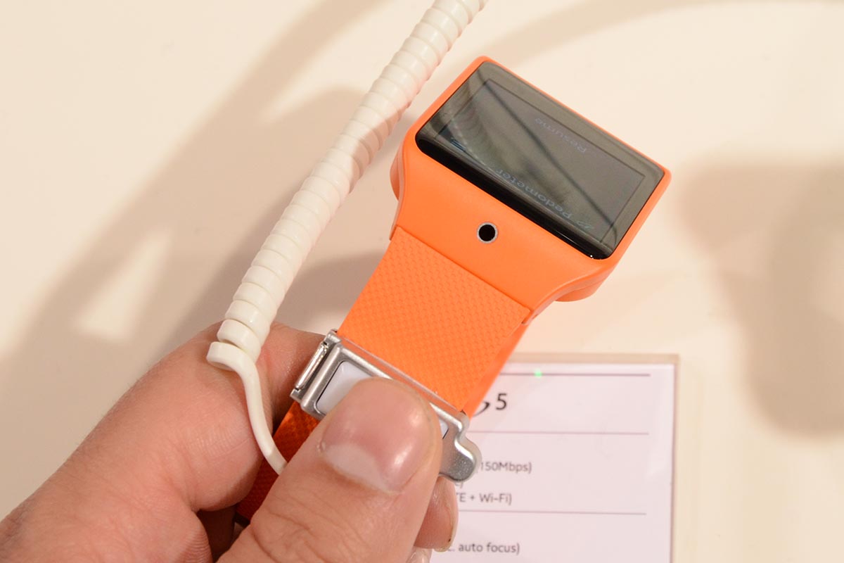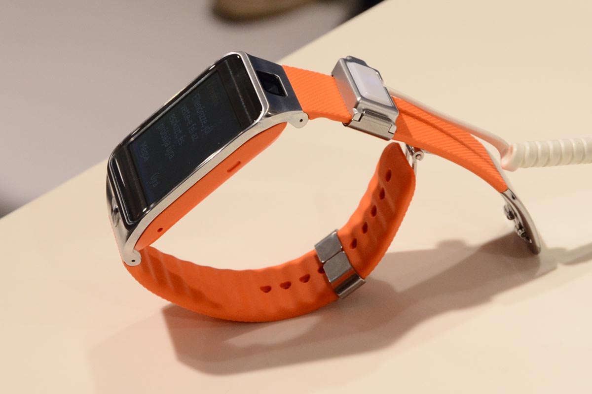 A 24-i Galaxy S5 bejelentés érdekessége volt egy harmadik viselhető eszköz, a Gear Fit felbukkanása. Ez egy fitneszre kihegyezett készülék, amely formája alapján sokkal jobban hajaz a riválisok megoldásaira. Tény, hogy jól néz ki, és emellett még könnyű is, mindössze 27 grammos a Fit. És, bár normál microUSB port van rajta, fedél nélkül, szintén vízálló! Ezen egy 1,84 colos, szintén AMOLED kijelző van, amely 432×128 pixeles, és ívelt – merthogy az egész óratest is az, hogy jobban kövesse a csuklónk vonalát. A szíj a Gear Fit esetében is cserélhető, a kommunikáció pedig ugyanúgy Bluetooth 4.0 kapcsolat segítségével, a vezérlés pedig alapvetően szintén az okostelefonos alkalmazás segítségével történik. Ez utóbbi képes automatikusan is letölteni az adatokat, hogy aztán az S Health tárolja és elemezze azokat. A Fit valamivel tovább, négy napig bírja feltöltésenként. Pulzusmérő van rajta, de kamera és infraport nincsen. A kezelése elég érdekes, ugyanúgy teljes képernyős nézetek között lehet lapozni, de a Samsungnál valamiért úgy gondolták, hogy jó ötlet a rövidebb irányt ráállítani erre a feladatra – szerintünk nem volt az, legalábbis a lapozás elég kényelmetlen volt. A Gear Fit alapvetően nem okosóra, de azért ha rajtunk van, és csörög a telefon, akkor meg tudja mutatni, hogy ki keres, valamint lehet vele kezelni a mobil zenelejátszóját is.
