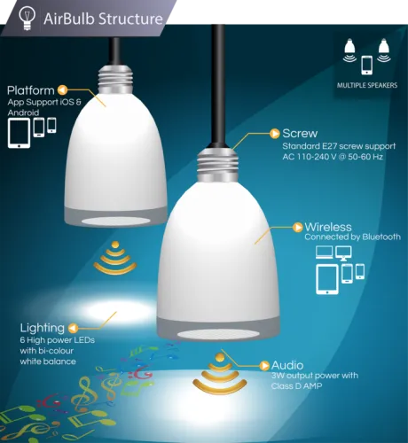 A hiánypótló eszköz egy olyan LED-es izzó lenne, amelyben Bluetooth adapter és hangszóró is van, így okostelefononunkról nemcsak a fényerőt és színhőmérsékletet tudjuk szabályozni, de lejátszhatunk zenét is. A további funkciók között hangos ébresztés (fénnyel együtt) és hívások jelzése fényeffektusokkal is helyet kapott.