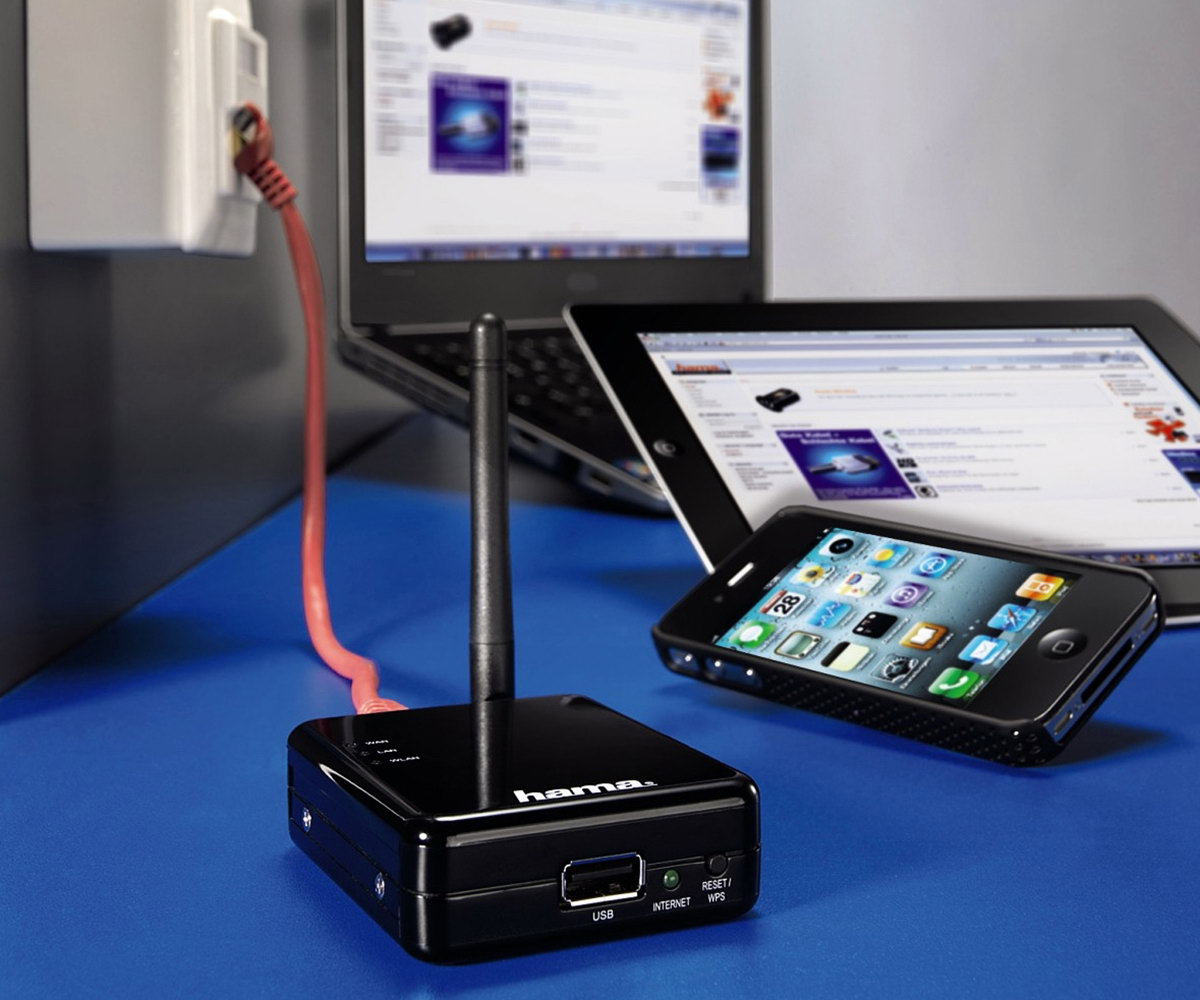 Működik a LAN-WiFi átalakítás is, ebben az esetben az adapter hozzáférési pontként szolgál, így erre csatlakoztathatjuk WiFi eszközeinket. A Hama adaptere a 802.11n/g/b szabványokat ismeri, így legfeljebb 150 Mbps-os sebességgel tud kommunikálni. Egy átlagos nappaliban/hotelszobában, feltéve hogy a router nincsen nagyon eldugva, az elméleti sebesség nagyjából fele realizálható is, ami bőven elég internetezéshez és ahhoz is, hogy internetről streaming videókat nézzünk. Az egyetlen problémánk abból adódhat, hogy az adapter 2,4 GHz-es frekvencián működik csak, ha esetleg olyan környezetben vagyunk, ahol a WiFi 5 GHz-es, akkor arra nem fogunk tudni csatlakozni. Ebben az üzemmódban ADSL- vagy kábelmodem jelét is megoszthatjuk, ilyenkor a kábelt nem a LAN hanem a WAN portba kell kötnünk.
