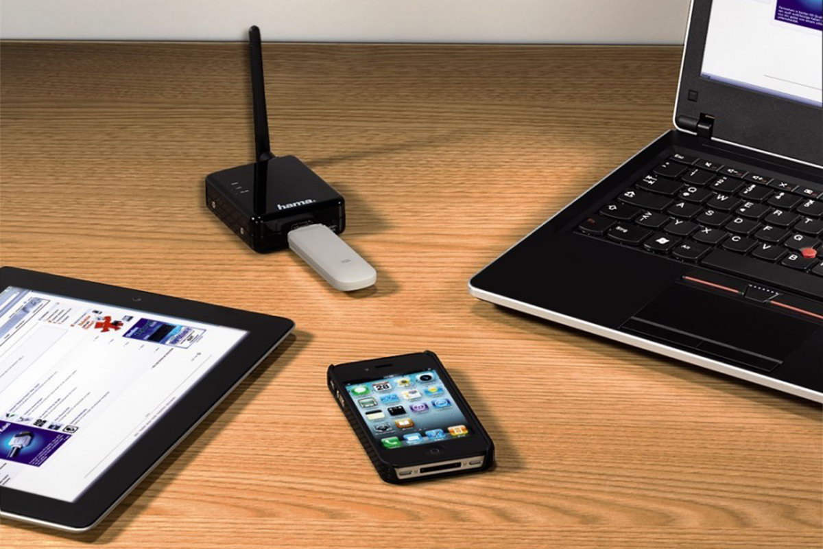 Végül de egyáltalán nem utolsó sorban a harmadik lehetőség az, hogy az USB portra olyan 3G vagy 4G sticket csatlakoztatunk, amely kompatibilis a Hama adapterével, így a mobilnetet tudjuk megosztani akár vezetékes kapcsolaton akár WiFi kapcsolaton keresztül.