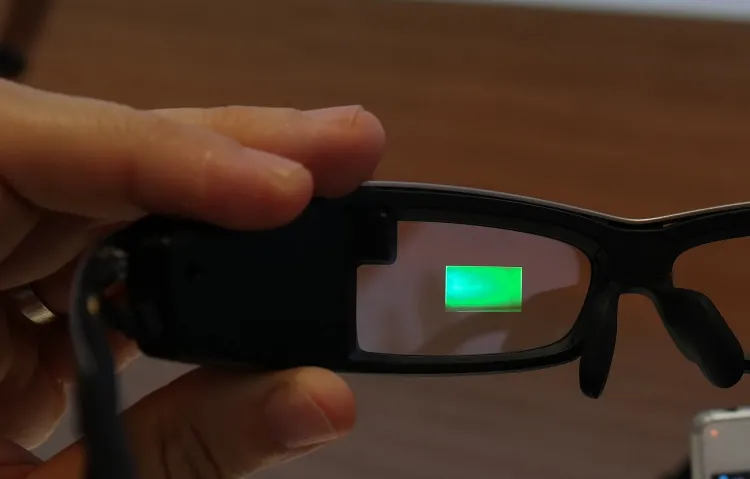 A Smart EyeGlass nemcsak külsőleg különbözik a lényegesen „lájtosabb” Google Glasstól, hogy nem kis LCD kijelző lebeg a szemünk előtt, hanem apró projektor vetíti a tipikusan szöveges információt a szemüveg lencséjére, és így jelenik meg a zöld felirat a látómezőnkben. Mivel a kijelző mindkét szemünk előtt ott van, elvileg semmi akadálya a 3D-nek sem, de egyelőre a demóban csak 2D-s applikációkat láttunk. Ezek jórészt a kiterjesztett valóságot valósítják meg, az információk pedig a csatlakoztatott okostelefonról származnak – például az éppen készített receptet látjuk lebegni a szemünk előtt, így nem kell a telefonhoz sétálgatni, hogy mi is a következő lépés.