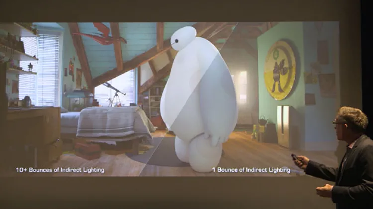A Big Hero 6 egy egész estés animációs film, amely egy fiú és egy robot barátságáról szól. Ezen kívül a közeljövőben elterjedő új technológiákról, a valóság és a virtuális világ kölcsönhatásáról is. Hiro és Baymax, a Marvel-képergények hősei nem mindennapi módon elevenednek meg a mozivásznon, hiszen a Disney egy minden eddiginél összetettebb rendszert – azaz rendszereket – használt a film elkészítéséhez. Korábban csupán az egyes animációs feladatokra írtak programokat, például az Aranyhajban (Tangled) Rapunzel hajának hullámzását szimulálva, vagy a Jégvarázs (Frozen) esetében a hópelyhek mozgására. Most viszont egy nagyot léptek, és létrehozták a Hyperiont, amely egy olyan rendering (képgeneráló) motor, amely a global lighting technológiát használja. A klasszikus ray-trace motorok a kamera szemszögéből kiinduló sugarakat követik néhány felületi visszaverődésig, a global illumination (GI) eljárásban viszont ezen kívül az egyes tárgyakra eső sugarakat is figyelembe veszik, amelyek módosítják a környezeti fényviszonyokat. Így például az üveggolyóról egy sötét sarokba tükröződő fény több részletet is megmutat, amelyek a GI eljárás nélkül rejtve maradnának. A probléma ezzel csupán az, hogy a korábbinál sokkal nagyobb számítási kapacitásra van szükség. Minél több felületről „pattan” le vagy halad át a fénysugár, annál élethűbb képet kapunk. Baymax, a puha orvosi robot például enyhén áttetsző, az új technológia hatása vele kiváló eredményt ad.