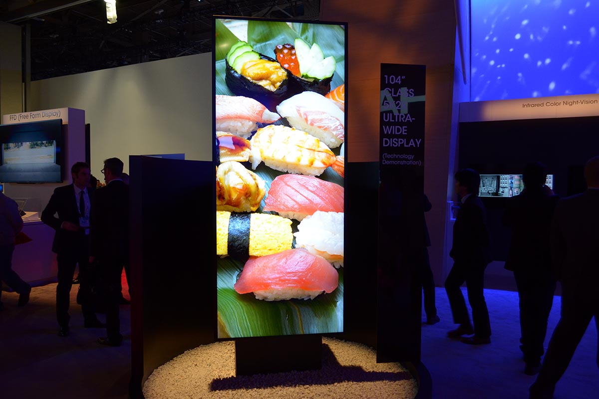 A második érdekesség a 104 colos, oldalára állított 21:9-es digitális hirdetőtábla volt, amely 5K×2K felbontású panellel és akár a kültéri használathoz is elegendő fényerővel rendelkezik.