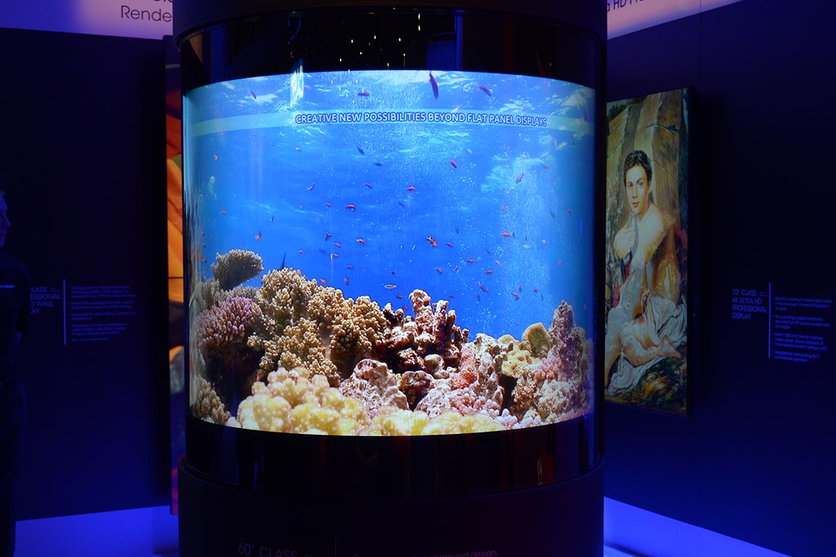 Ma már minden magára valamit is adó panelgyártónak van olyan megjelenítője, amelyet direkt digitális hirdetőtáblákhoz fejlesztett ki, így aki ki szeretne tűnni a sorból, annak különleges megoldásokkal kell előrukkolnia. A Sharp komolyan vette a dolgot, és a standon demózott több vállalati ügyfeleknek szánt panelt is. Ezek közül a legérdekesebb a kör alapterületű, 50 cm-es sugarú oszlopra felcsavart kijelző volt, amelyet a japán vállalat a Sakai Display Products (DSP) nevű gyártóval közösen alkotott meg. A panel kiterítve 60,1 colos képátlóval bír, és 150 fokos szeletet fed le.