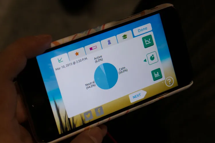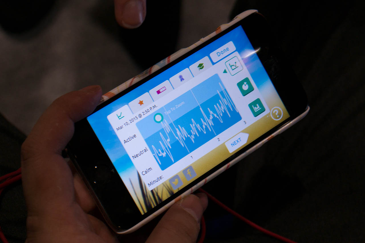 Maga a fejpánt lazán öleli körbe homlokunkat, és az agy elektromos hullámait figyeli. Ha pihenni szeretnénk (bocs, edzeni a relaxációs képességünket), akkor fel kell tenni a fülhallgatót és bekapcsolni a mobiltelefont, ami a fülhallgatón keresztül mindenféle természeti zajokat játszik be nekünk, és közben mondogatja, hogy lélegezzünk mélyeket. A feladat igazából az, hogy magunkra minél nagyobb nyugalmat erőltetve az általunk hallott természetet is elcsendesítsük (ha nagyon idegesek vagyunk, több lesz a távoli mennydörgés például). Az általunk kipróbált szeánsz 3 perces volt, és nem voltunk túl sikeresek – persze a körülöttünk beszélgető tömeg sem segít abban, hogy a szavanna susogására koncentráljunk.