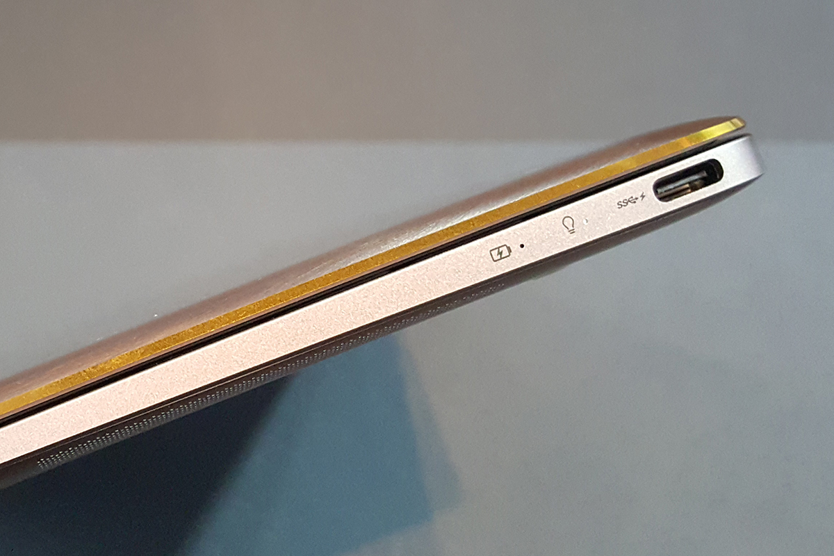 Túl sok időt sajnos nem tudtunk eltölteni a géppel, de azért néhány percre sikerült kézbe venni. A fizikai méretek valóban lenyűgözőek, főleg ha abba is belegondolunk, hogy a 910 grammos tömegbe a ma abszolút csúcsot jelentő hardver is belefér. A vékonyság ellenére a gép nem nyeklik-nyaklik – nyilván ha valaki meg akarja hajlítani a masinát, akkor meg fogja tudni, de attól nem kell tartani, hogy mondjuk a táskában megsérül a kijelző. Az viszont nagy kár, hogy az LCD nem matt, hanem fényes, még akkor is, ha erre az érintőkijelző miatt előbbi verzió eleve nem is jöhetett szóba. Az USB Type-C csatlakozónak inkább akkor lehetne örülni, ha nem ez lenne az egyetlen csatlakozó a gépen, így viszont esélyes, hogy a dokkolót utazáshoz is magunkkal kell vinni, ami elég sokat ront a kényelmi faktoron.