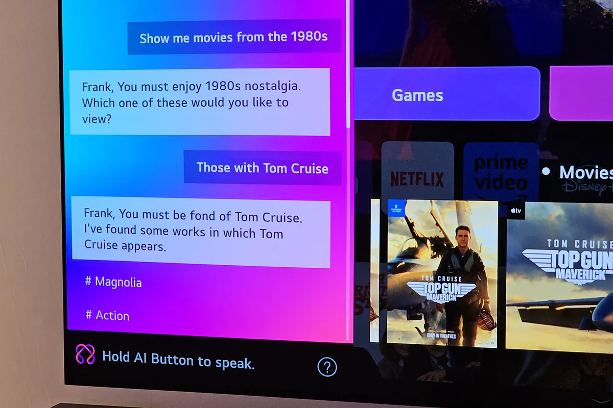 Az AI-t nyilván sok mindenre lehet használni, de véleményünk szerint az LG-nek sikerült olyan funkciókat kimazsoláznia, amik valóban hasznosak lehetnek – kezdésnek itt van rögtön az, hogy a tévé hang alapján felismeri a családtagokat, így mindenkinek saját profilja lehet. A tévé persze gyűjti a személyes adatokat, legfőképpen azt, hogy milyen jellegű műsorokat nézünk – ez a későbbi tartalomajánláshoz fontos. Érdekes adat, hogy az átlagos felhasználó napi 30 percet tölt azzal, hogy azon gondolkozik a tévé előtt, hogy mit is nézzen. Az AI ezt az időt lerövidítheti, hiszen szépen lassan megtanulja az ízlésünket, és pontos személyre szabott ajánlásokat tud adni.